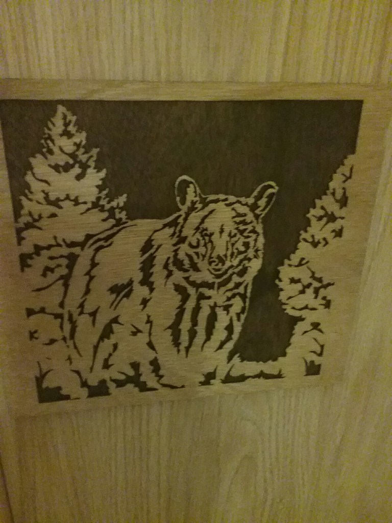 I believe that the expression is, “One man’s trash is another man’s treasure.” I have come to believe that there is value in everyone and everything. As Disney’s Pocahontas sang that, “Every rock, and tree, and creature has a spirit has a name.” I was in Cindy’s Fudge and Ice Cream Shop yesterday in Mineral Point, Wisconsin and bought a most delicious piece of chocolate walnut fudge. While there I noticed that hanging on the wall were several pieces of wooden cut out art. I remarked to a friend later that I would like to have a piece of art like that to hang on the limited wall space in my travel trailer. Today at Crazy Frank’s Flea Market also in Mineral Point my eye caught such a treasure so reasonably priced that I could not let it pass. The beautiful bear in the woods is pictured with this piece and I have already hung it in my motel room and will transfer it to my travel trailer when I move back into it in a couple of weeks. I have the bear near my desk where I write for added inspiration.
