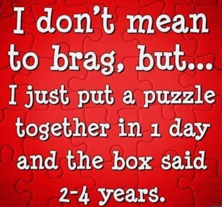 Today’s theme picture is a funny one that I received just yesterday in an email from a dear friend. I get the joke but in keeping with my slightly skewed view of things I ask you to consider that we should count all of our successes not just the seemingly big, impressive, important ones. I happen to enjoy putting puzzles together and little to me is more thrilling or rewarding than after an especially difficult, tedious, and time consuming one – putting in that final piece to complete the puzzle picture.