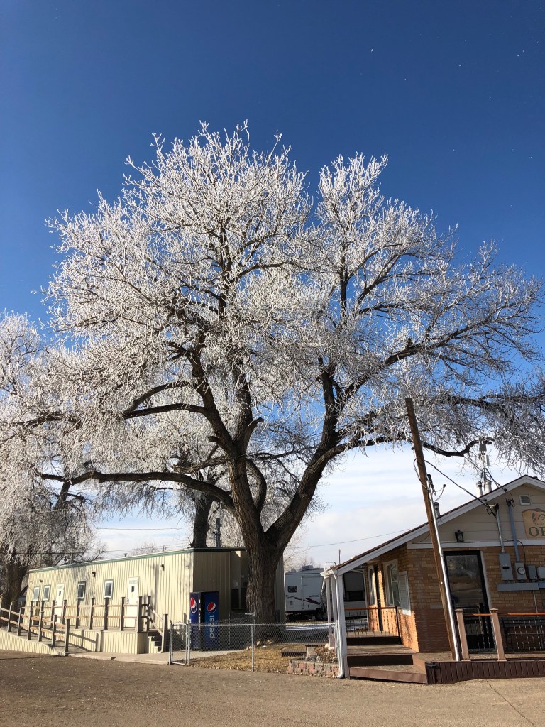 On the last of my four days off work for Christmas I received a most special gift. I got two beautiful pics of it to share. I love snow in all its wondrous and unique forms. Snow to me is like the Universe’s love gift to me, like manna from Heaven it feeds my soul and stirs my heart. As I left my little trailer about mid-day the last snow had almost melted completely away. We had no White Christmas in Cheyenne, Wyoming, that in itself a rarity. But with the sun shining I saw great gobs of snow falling so I looked up, always an important thing to do, and saw the tree limbs flocked with snow. I just knew that I would have to share these pics in a post to all of you.
