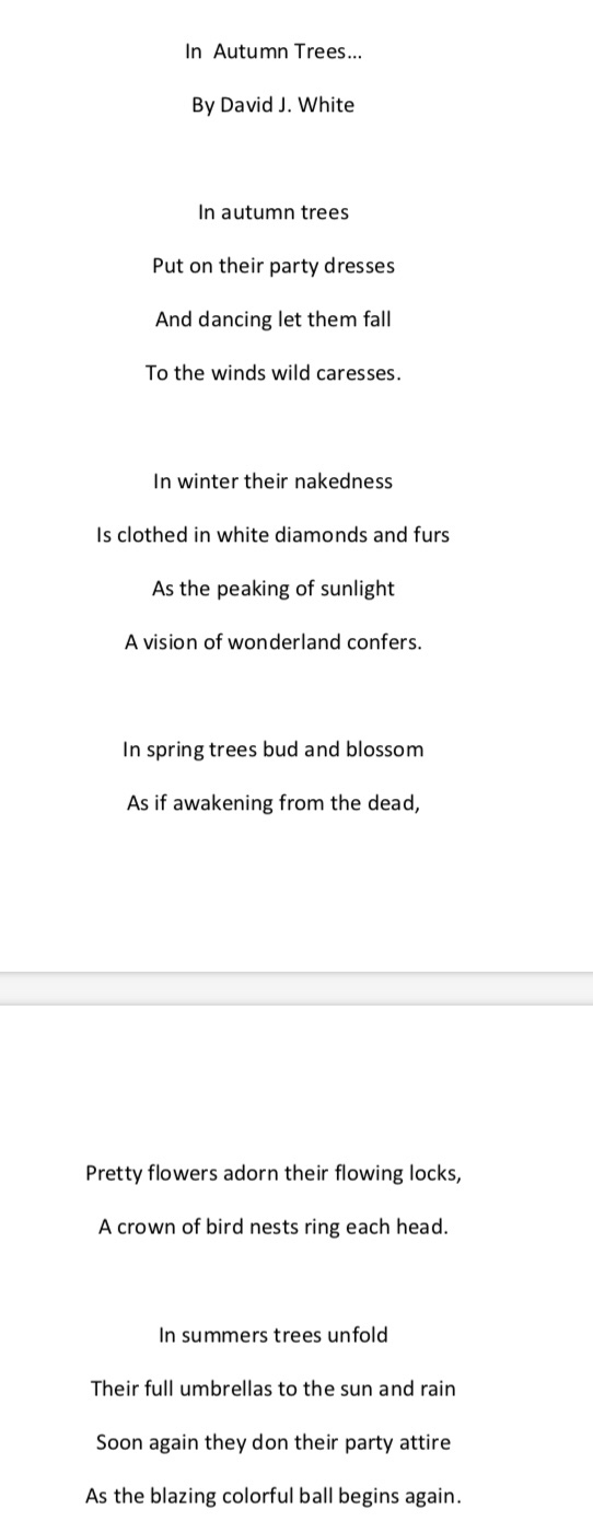 There is a line in a sad love song by Barry Manilow where he sings, “I hate to see November go.” There can often be a bit of melancholy letting go of anyone, anything, or any month. September has a lot of special memories for me and I am sure it does for many of you. We met so many of our school friends in this month over the years, fell head over hills in love more than once. Those of us from northern temperate zone climates with fours seasons felt summer change to fall and those below the equator, winter to spring. And autumn and spring are both seasons in which the the trees put on some of their prettiest party dresses – blossoms and bright green buds in spring and flaming colorful leaves in fall. I share a poem I wrote several years ago about trees and their year round party dresses: