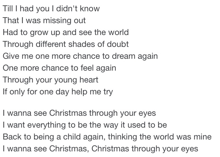 On my 1,150 mile journey from my work assignment in Indiana back to Houston, Texas, the past days I kept trying to find radio stations that were playing Christmas music from standards like Bing Crosby’s White Christmas to the latest hip-hop Christmas tunes. One of the loveliest and most moving Christmas songs that I heard again was Gloria Estefan’s, Christmas Through Your Eyes. Here is the first verse and chorus for you: