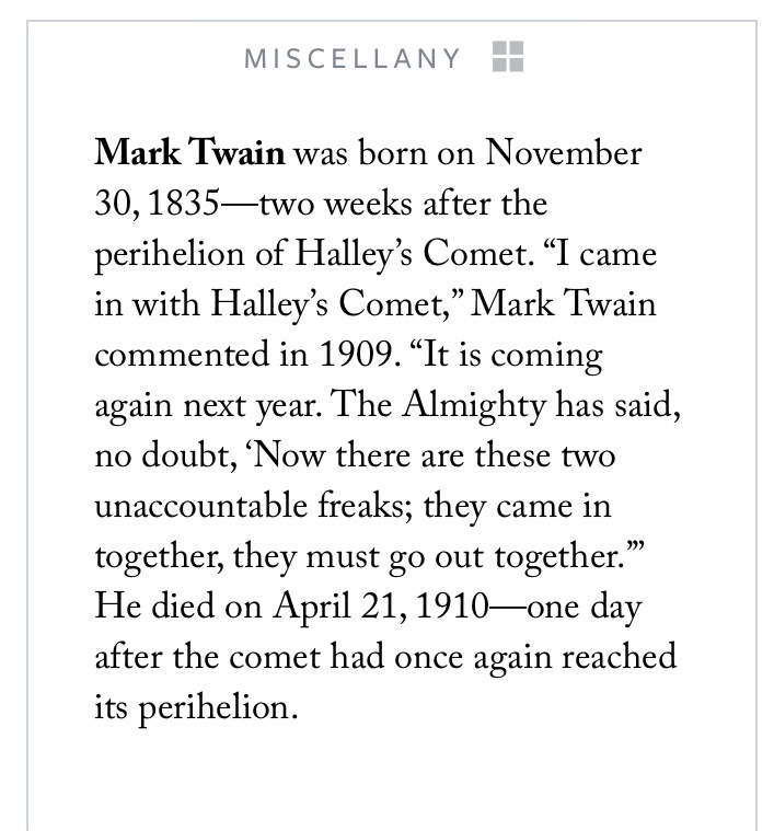 “I always try to hold on to a few vices because they come in handy bargaining with God for more time. You know, ‘God if you let me live, I will give up…’” I found this little tidbit online: