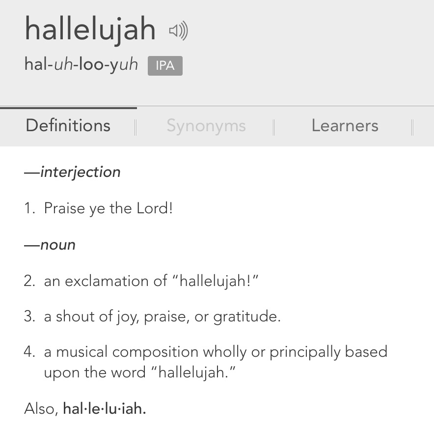 I attach the above screen shot of my phone dictionary to remind myself and all who read this what I am writing about today. The number 3 definition is my pick: “A shout of joy, praise, or gratitude.” Well, hallelujah.