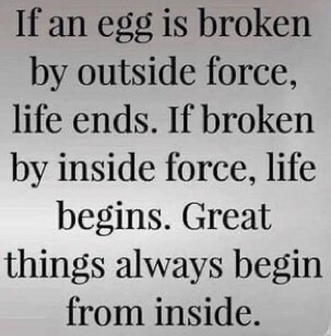 Instead of allowing this world to slap, tap, and wrap us up in a neat little package or shell we should tap into the power within us and expand our world view our heavenly view outward. The egg shell is shaped oval to be harder to break from without but is easily cracked from within.