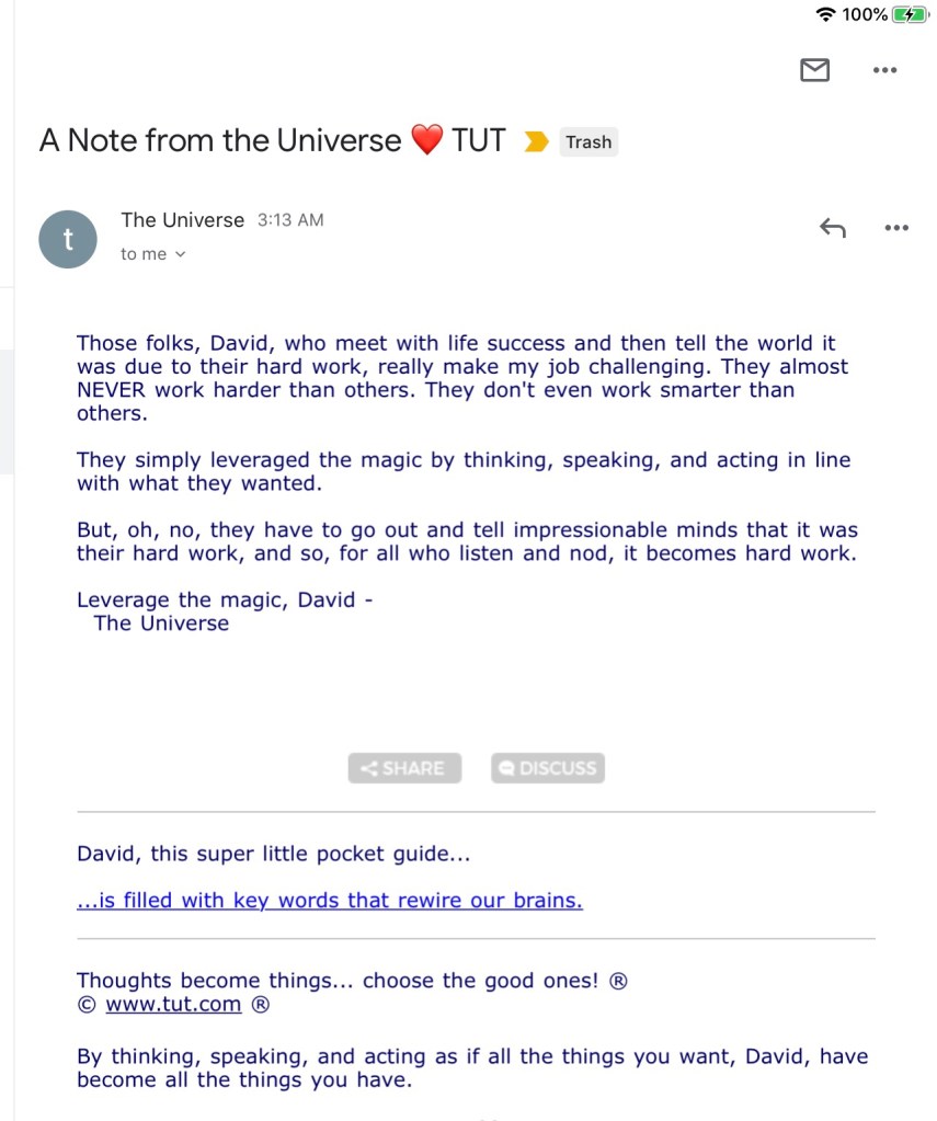 We are most often told by highly successful people that their success, at whatever, is due to hard work, but that just is not true. As my Note from the Universe this morning reads, and I agree, it is not hard work we need so much as just a clearly defined dream. By far the hardest part of the process of success is just figuring out what it is we truly want and putting our request out there, fully expecting to receive it. But read the note for yourself:
