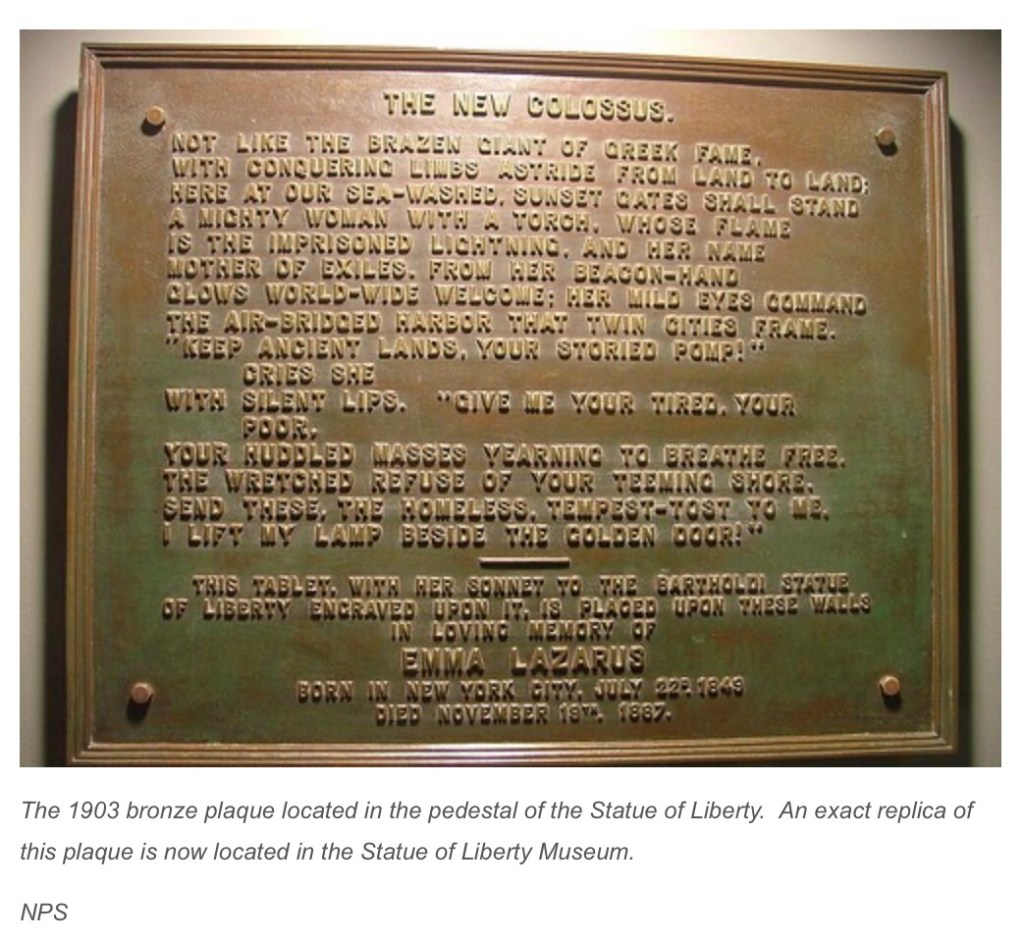 In contrast to the above I quote the entire poem The New Colossus the words of which words are still on a bronze plaque below a lovely French Lady that has for over more than a hundred years welcomed people of all countries, creeds, and economic statuses to our shores: