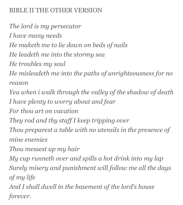 I believe God gets blame for a lot of crap and perhaps credit as well too for stuff that He/She/We are equally responsible for. That is what I see most playing out in Bernie’s version of the Twenty Third Psalm. One does not have to look too hard or too far to see the troubled side of life and often it may take some conscious effort to stay on the sunny side and not stray into the shadows. We have all been down that road and it is no fun with no sun and no one to comfort us. But, I believe that in every case that is just illusion, the God’s truth being that surely goodness and mercy have and shall follow us all the days of our lives and we shall dwell in the house of the Lord forever and not in the basement but in a beautiful penthouse apartment of our own, perhaps right next door to a Bernie maybe even two.