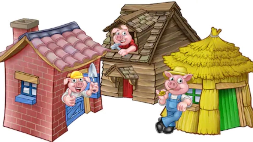 This is one of the first stories that I ever recall being read to me as a boy and I can still see the illustrations of the first little pig’s straw house blown down by the big bad wolf, then the second little pig’s wooden house likewise, but the third little pig’s well built brick house standing strong with the third little pig and his two brothers with him safe inside.