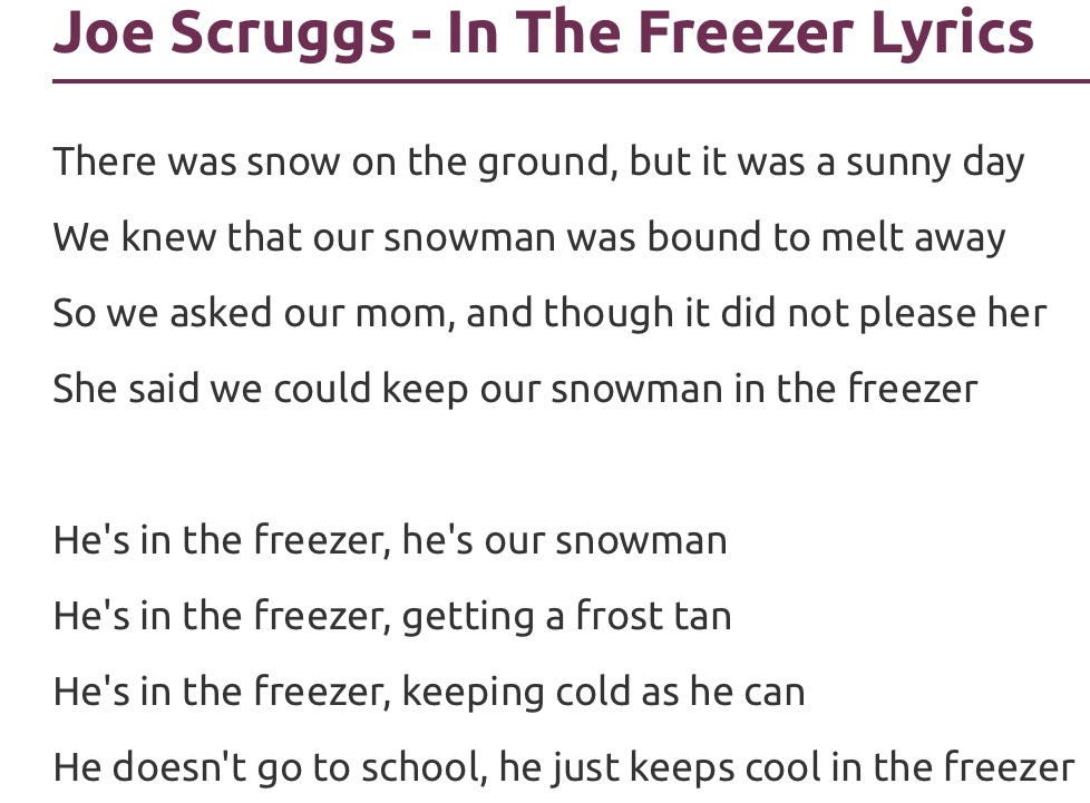Just Google – In The Freezer- to see and hear a video of this wonderful song by Joe Scruggs and have a laugh.