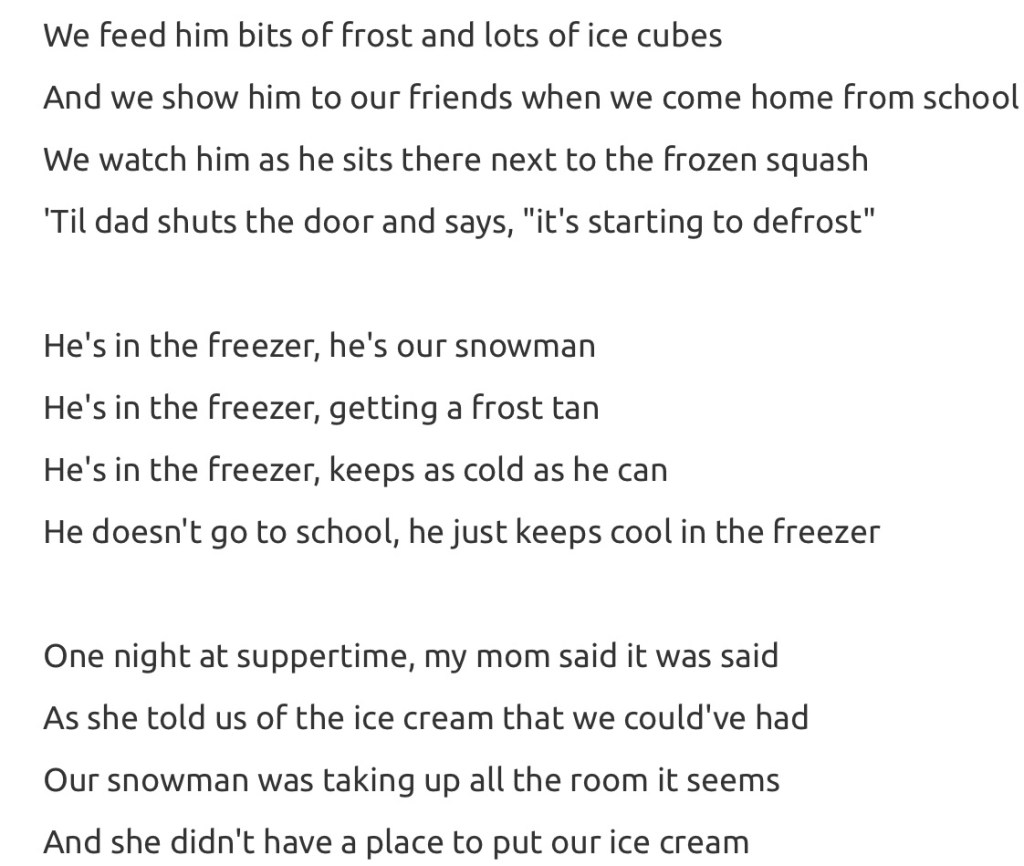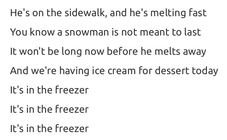 The last part of the song is about summer and ice cream and mom explaining that there was no room in the freezer for ice cream. The lines beginning the last chorus go: “He’s on the side walk and he’s melting fast. You know a snowman is not meant to last.” It seems those children got their priorities straight long before the summer was over.