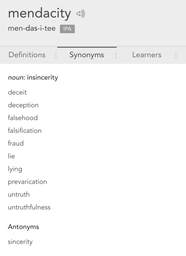 The words Bull and Mendacity are used as synonyms and bantered about a great deal in the movie. The dictionary defines mendacity: