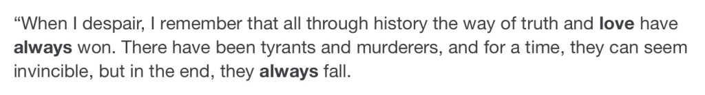 With what wondrous anticipation is the return of a loved one and this children’s song completely captures it. I watched again the wonderful movie, A Beautiful Day In the Neighborhood, yesterday and was again in tears at the words of children entertainer Fred Rogers as he explained his motivation to a reporter interviewing him, that he just wanted to help children to be able to express their emotions without hurting themselves or others. Over the weekend I had watched a movie that I have long thought I would like to but never had until then, Gandhi. Gandhi and Fred Rogers both were spiritual giants, but then the same “God spark” that dwelt in them dwells in each of us. We have only to fan it into a flame that will not only warm our own hearts but draw people to us in droves to warm by our fire. This ought to be our deepest desire, hobby, and full time job – shining our inner light and warming our neighborhood and world. This is global warming that we all can believe in and support.