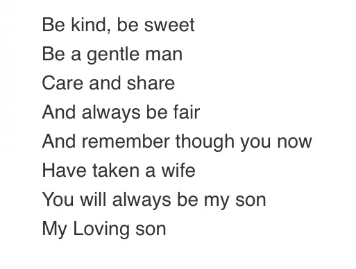 A Song For My Son is the perfect song for Linda’s dance with Jay and has in it, I think, the best advice a mother could ever offer a son on his wedding day.