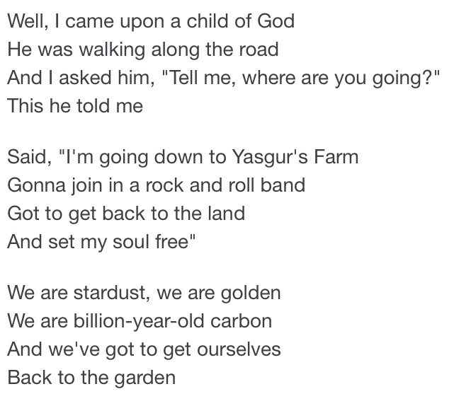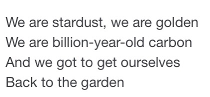 As I was writing the above, just now, a few lines from the song, Woodstock, written by Joni Mitchell came to me and I clipped them for my blog picture today. Most of the greatest problems that we experience in this life stem from not knowing Who and Whose we are. “We are stardust we are golden and we’ve got to get ourselves back to the garden.” We are no matter what we have said or done, children of god, and even all those who mistakenly think themselves gate keepers can also freely bow and say Namaste to one another.