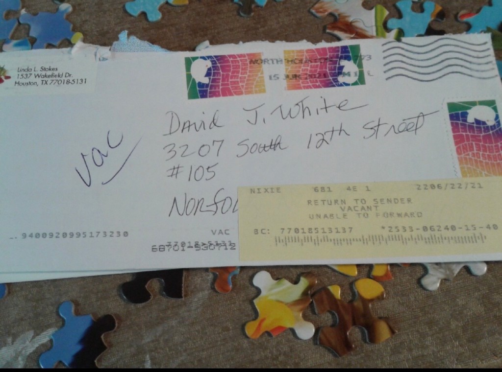 Yesterday, my loving and lovely wife, Linda, texted me a photo of something she had received in the mail – the letter with the important documents marked with a yellow label that read Return To Sender – Vacant and dated 06/22/21. I have printed a copy of the picture and plan to be at the Post Office when it opens this Saturday morning and to share that picture with the counter clerk.