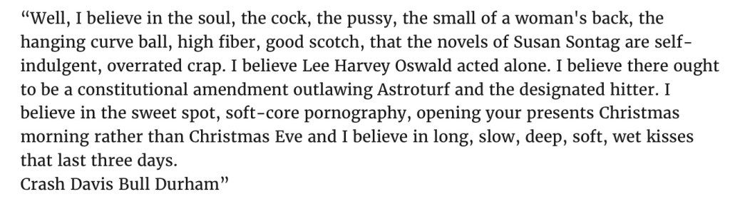 Some prudishly hypocritical religious folk may try to act offended at some of Crash’s word choices above, but I would not change a word of that wonderful speech and it touched Susan and Tim Robin’s hearts and those of audiences around the world as Kevin’s character described a baseball catcher’s belief system. Anyone might disagree on a point or two, but one who has experienced one of those kisses mentioned for breakfast, lunch, dinner, or a mid-night snack will admit that they know what the true breakfast of champions ought always to be.