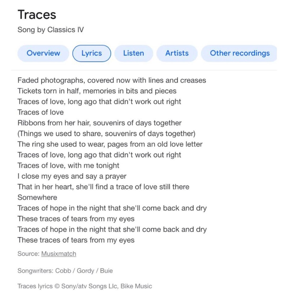 In nineteen-fifty-seven crooner Pat Boone had a hit single called “Love Letters In The Sand.” Like many romantic love songs it speaks to the fleeting and temporary nature of most of the lesser loves. Another song that was quite popular with young people a few years later, “Traces” also speaks to the debris of ship-wrecked love.