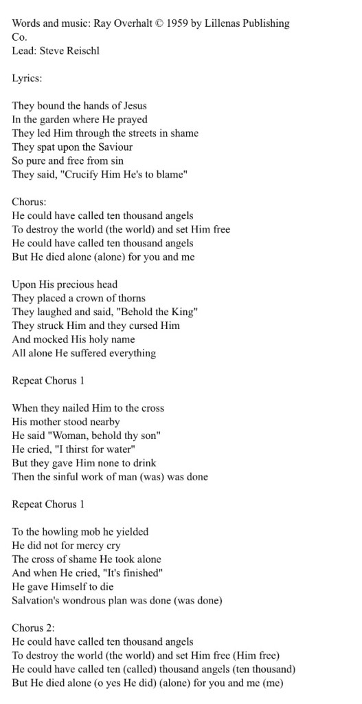 One of my favorite verses in the New Testament reads: “Seeing as we are ever surrounded by a cloud of witnesses let us run with endurance the race that is set before us.” The analogy is of an Olympic long distance runner mid-stride, cheered on by adoring fans. Many folks believe they have but one guardian Angel watching over them and sadly even more believe there is no one watching, no one who cares. But, I have it on the highest authority that just like our elder brother Jesus, each of us has more than a legion, ten thousand angels, on stand-by duty, that we can call upon to aid us at any moment. My other brother, Robert, used to sing this song in church when we were boys. Ten Thousand Angels and My Cup Runneth Over With Love are two songs I always associate with my beloved brother. Here are the words to Ten Thousand Angels: