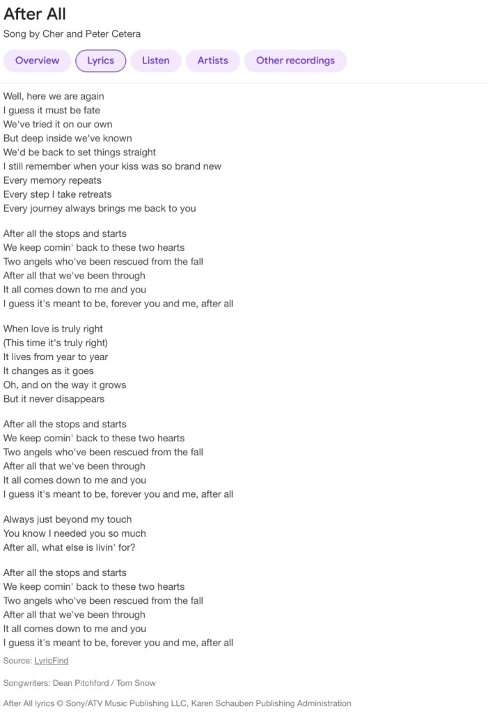 In a letter to my wife this morning I referred to Time In A Bottle and expressed my sincere belief that she and I have probably looked for and found each other in countless previous adventures in time and space and probably will in many more yet to come. It is not an original thought, but one garnered from many books and movies. Two movies that immediately come to mind are Chances Are with Sybil Shepard, Robert Downey Jr., and Ryan O’Neal and What Dreams May Come with Robin Williams, Annabella Sciorra, and Cuba Gooding Jr. In addition to Johnny Mathis’s wonderful song, Chances Are, the movie of the same name also has Peter Cetera and Cher doing a wonderful duet called After All.