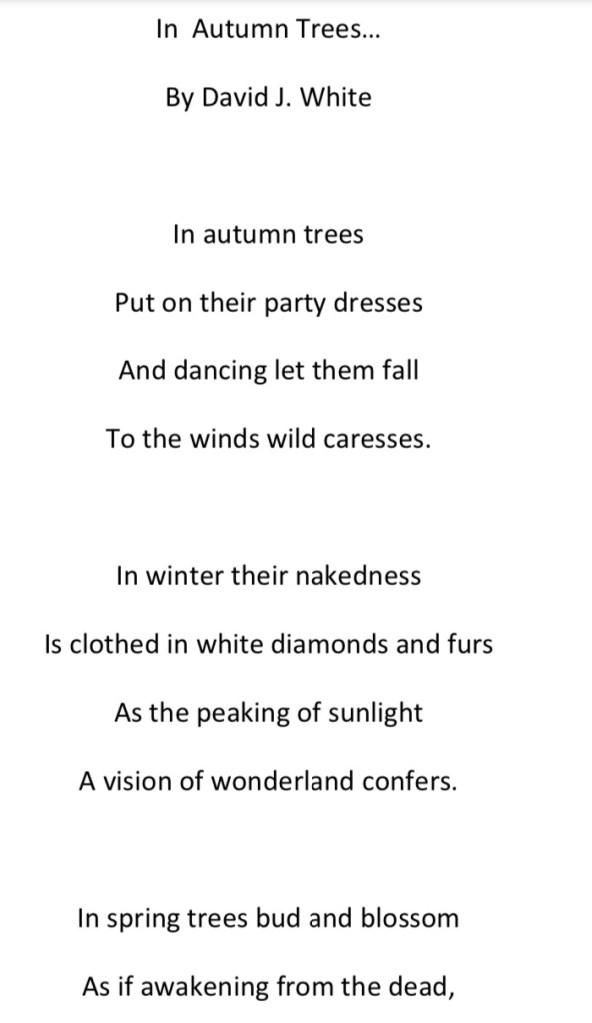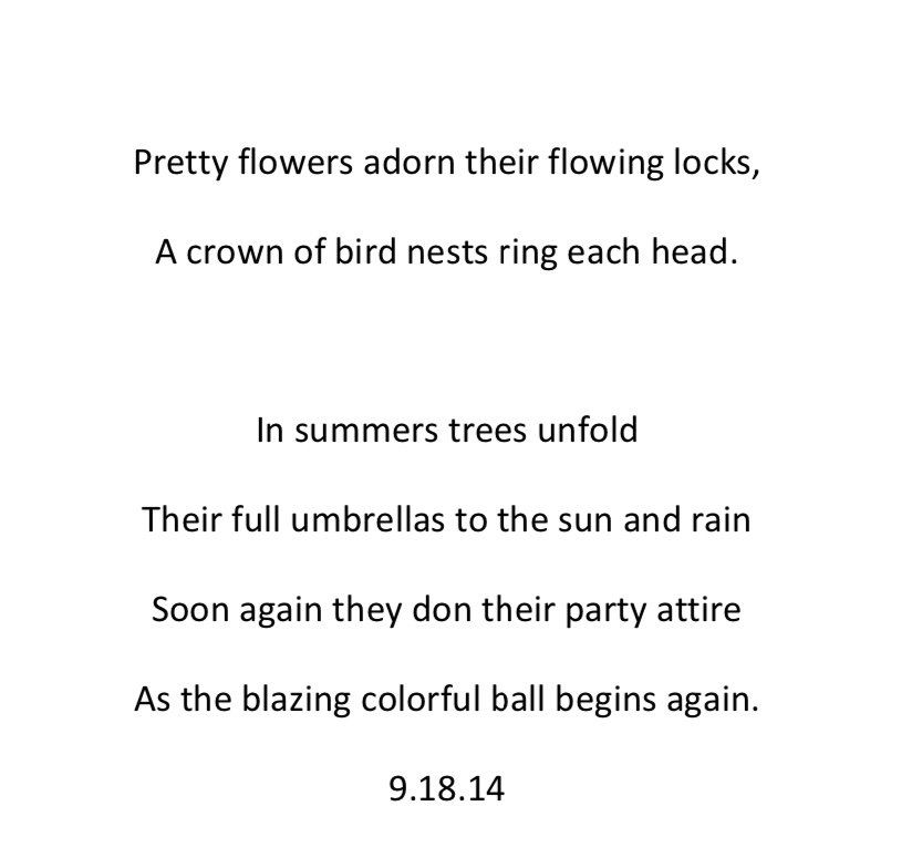 As you can see by the pictures I got the skirt finished before the trees put on their party dress this year. Instead of a song today, I attach a poem I wrote several autumns ago about the trees putting on their party dresses.