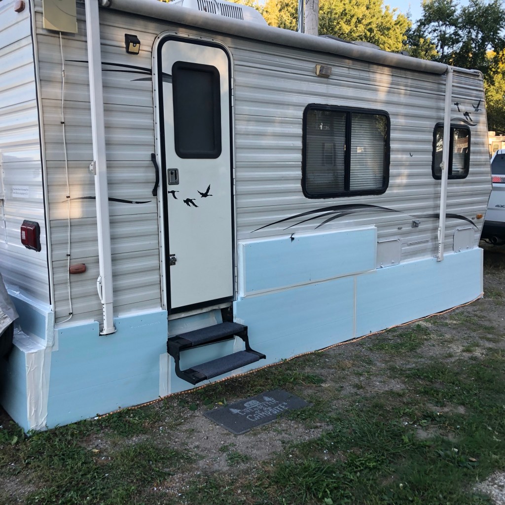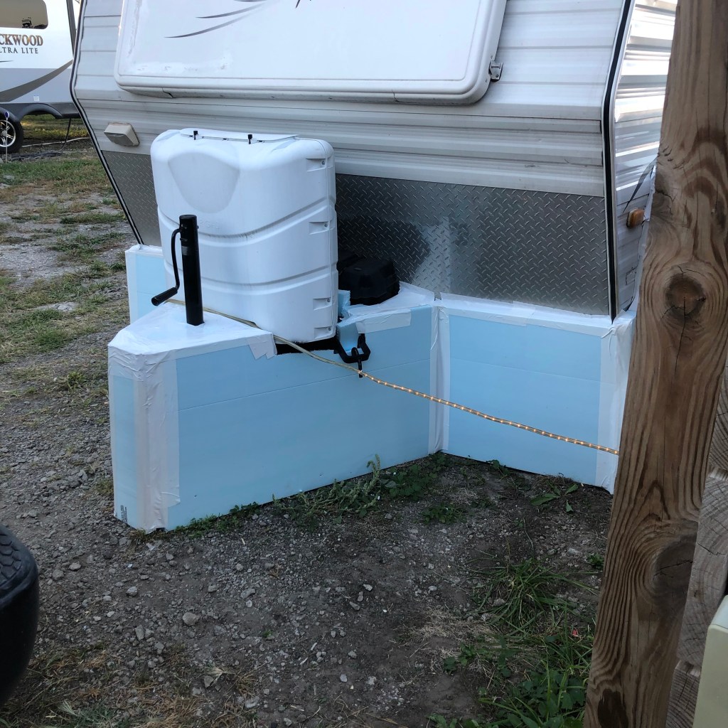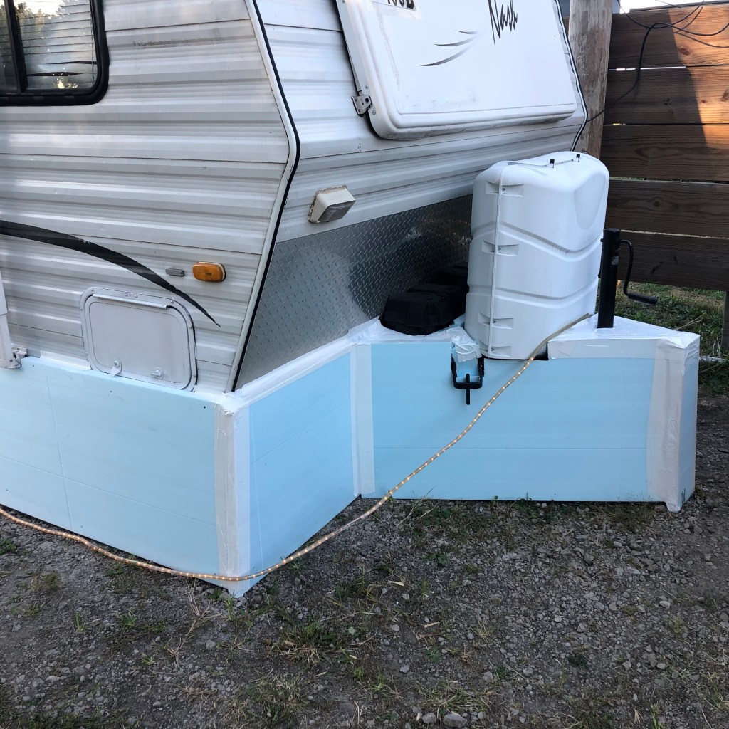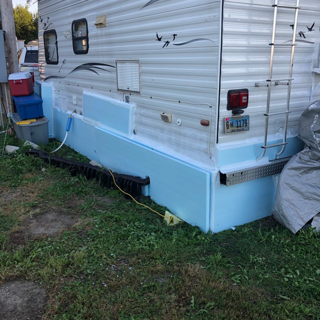 My first winter in my little house on wheels on the prairie was spent in Baggs, Wyoming. I was told that I would need a water hose with a heat strip and to skirt the trailer and put a couple of heaters underneath it to keep my water flowing all winter. That was the first skirt I ever made for her, but not the last. It was already cold before I put it on her and it was hurried with minimal planning and though it did the job, I vowed to do better job the next time. And I did in Crawfordsville, Indiana. That skirt was by far the most elaborate and prettiest, made of plastic double sided fencing panels, with painted plywood hinged doors to get underneath to drain the sewer tank and so I could store things underneath. Several years later I had another assignment in Indiana that went into December so I again had to shirt the trailer, this time I used thin plywood with thin insulation attached to the inner side. It was a long and tedious process and it was cold before I competed it.