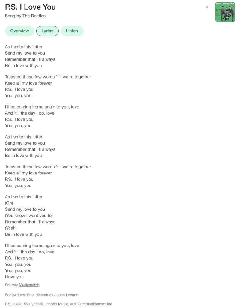 Before “Yesterday” took it’s place as my favorite Beatles’ song that place was held by another love song of theirs called, “P.S, I Love You.”