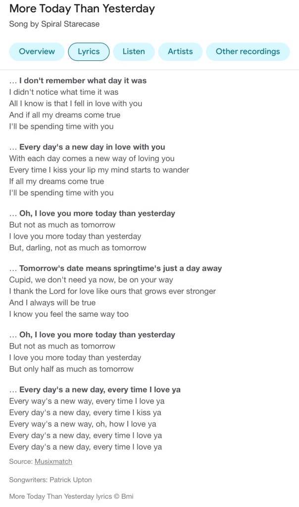 Signing off my daily morning love letter to my lovely and loving wife Linda I remembered a line from a love song from the last year that she and I were both teenagers, 1969, and told her that I love her more than before but not as much as tomorrow. I took a little poetic license with the quote as you can tell from the complete and correct lyrics that follow: