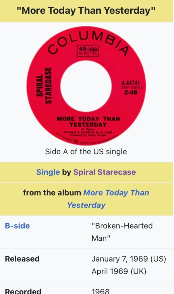 The above song was the biggest hit of the American pop band named after the 1946 movie The Spiral Staircase with a deliberate misspelling. “More today than yesterday, but not as much as tomorrow” is the signature line in the song and it’s title. The song could have been as easily titled, “Everyday day’s a new day.” Indeed each one is and it is up to us to find in each one that special someone or something that we can be happy about.