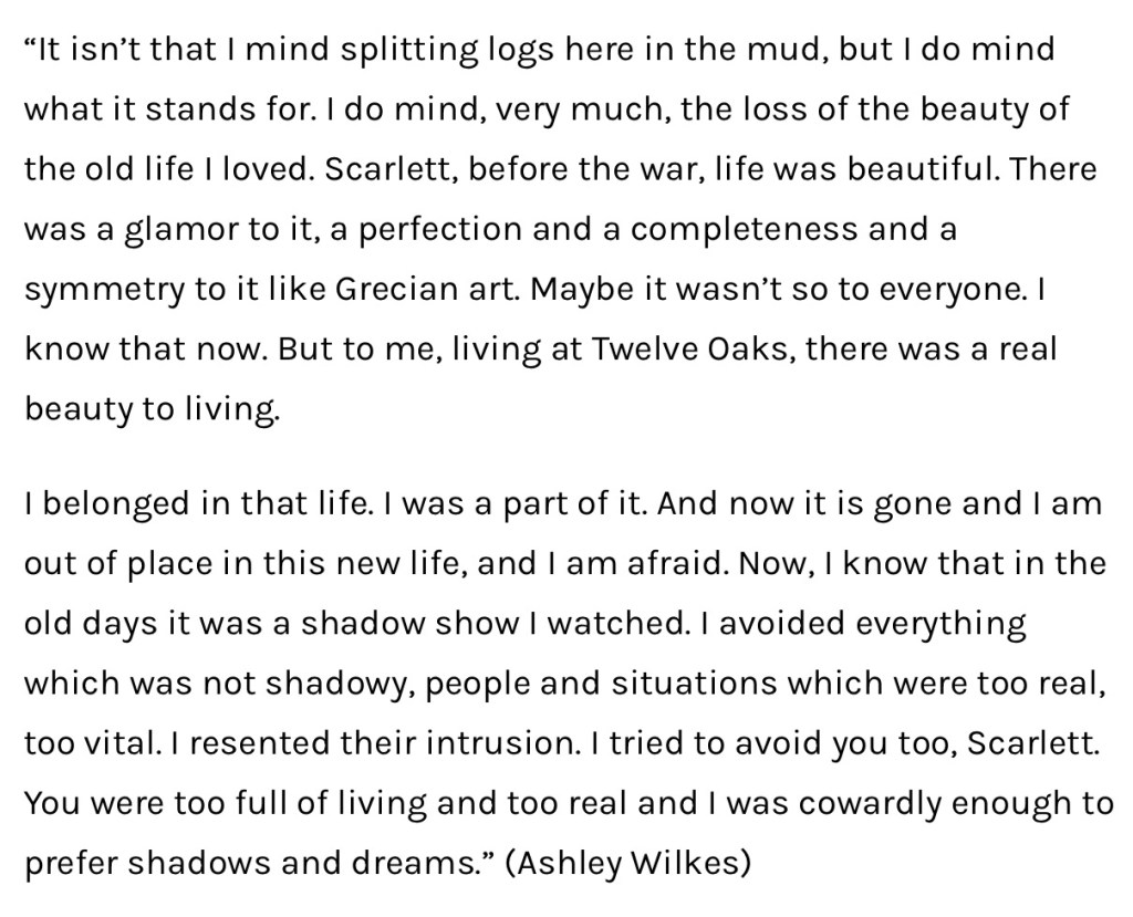 I in no way defend the segregationist thinking attempt to recast slavery in a better light that still looms large in Margaret Mitchell’s best selling book and the movie made from it, Gone With The Wind, but there are some interesting glimpses into her mind and the minds of so many who thought then and still think like she did during her relatively short life from 1900 to 1949. Scarlett O’Hara, probably not one of the deepest thinkers, has several conversations with her mostly fantasy love Ashley. Rhett Butler knows her in some ways better than she knows herself and says it is because they think so much alike. He tells her in one place that she will never understand Ashely’s mind. The closest she comes before the woman who knows and loves Ashely best and her too, Melanie Wilkes, dies is in a conversation with Ashely where they are both remembering their neighboring plantations before the terrible war destroyed almost everything they knew then. Here is Ashley’s side of that conversation: