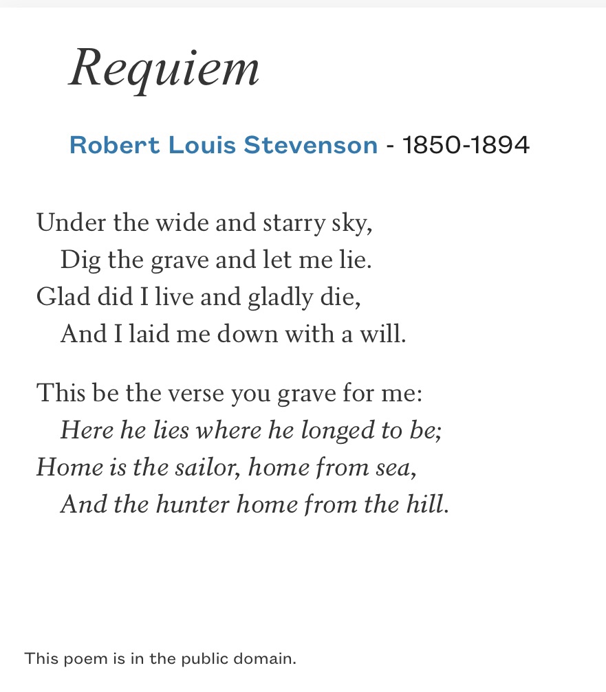 Don’t get me wrong, intend to continue to enjoy this go round as long as it is fun. My requiem if I get to choose it is not so unlike the Scot bard, Robert Louis Stevenson’s, but comes from a more contemporary American poet, Jim Henson, through the mouth of one of his Muppets, band leader Doctor Tooth, and goes like this : “There’s a party all the time for them that choose.” Or to quote two other contemporary American poets, Bill and Ted, “Party on.”
