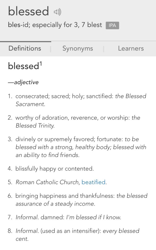 I think the fourth definition is more than all that other religious mumbo jumbo the true definition of what it means to be blessed, “To be blissfully happy or contented.” The sayings of Jesus called The Beatitudes in the King James Version read “blessed” and the more modern translations use as a synonym for blessed the word happy. I Like the rendering below from Luke and Matthew “Blessed/Happy.” Christians are not the only religious group that in my opinion think they are more special, more chosen than others, more blessed as it were. The proof that we are blessed is the evidence that we are happy.