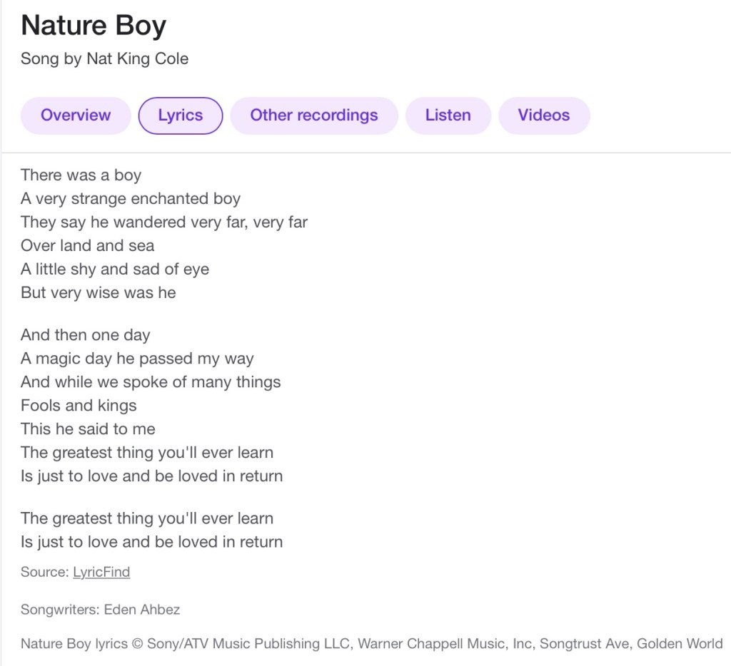 The concluding lines in Nate King Cole’s hit song Nature Boy say it perhaps even more clearly than Scripture: