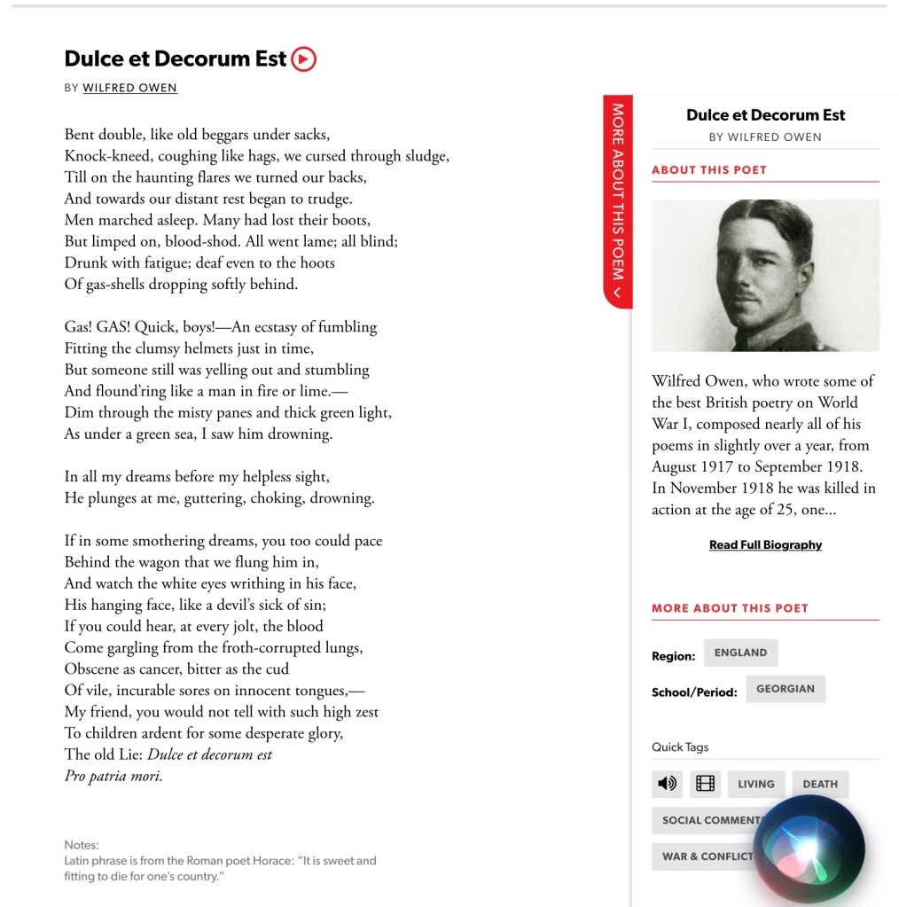 The poem is entitled Dulce et Decorum Est and is short for the Latin Horace quote defined at the bottom of the attached complete poem.