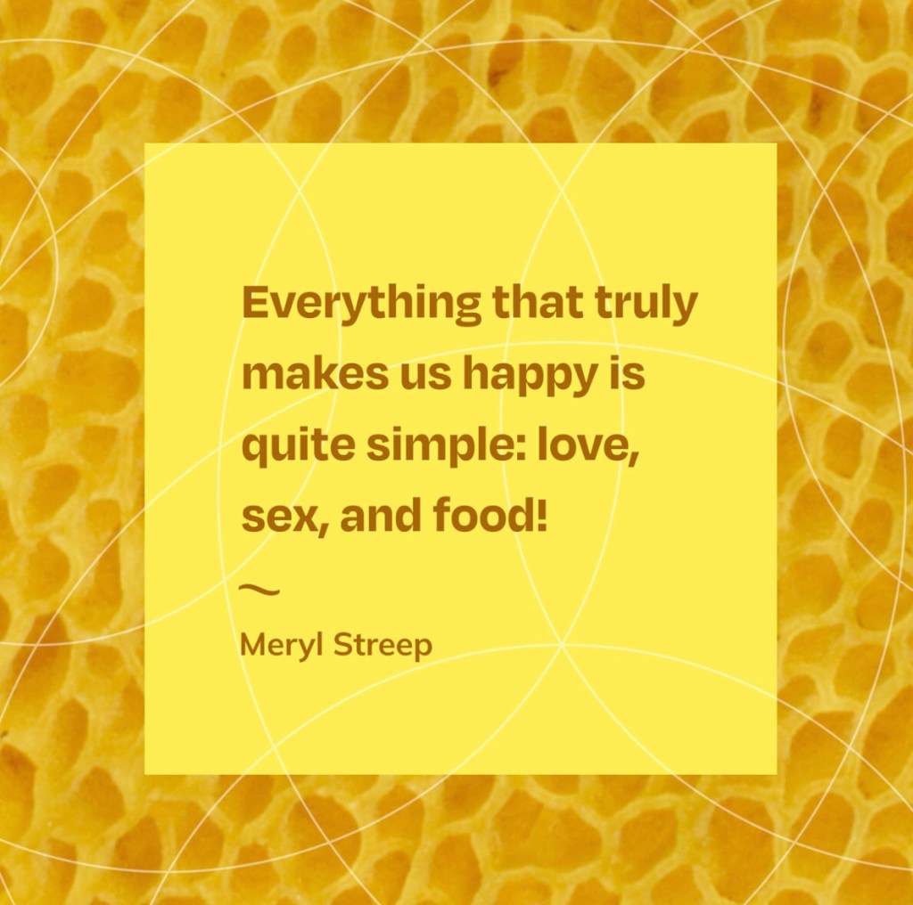 We are all quite basic and for all our pretensions otherwise the three things Miss Streep mentions above, love, sex, and food, do contribute most to our happiness. Remove any one of those three things from the human equation and both Jack and Jill are dull, listless, and unhappy people.