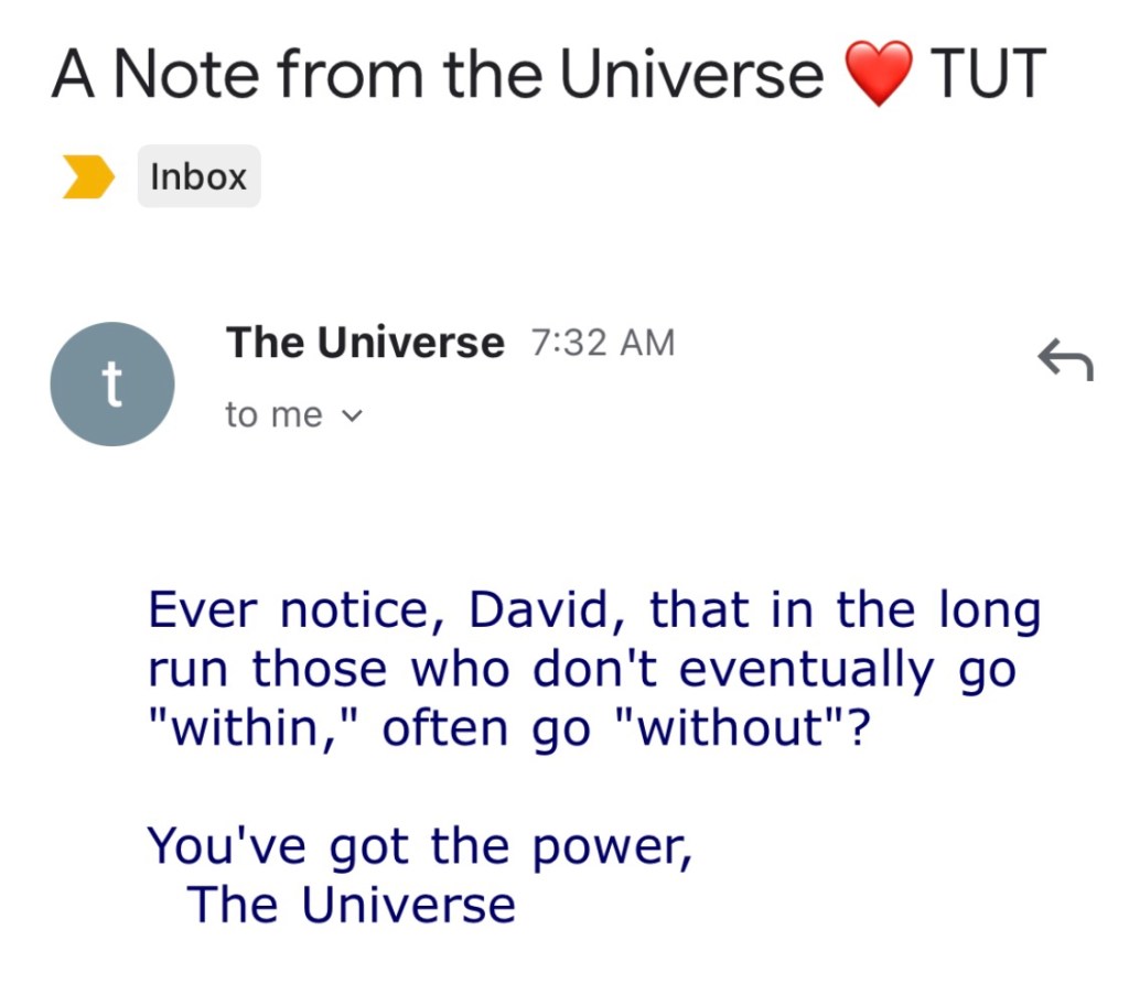 Some years ago, I signed up to receive daily Notes From The Universe. Yesterday I received the above. For those of you who give more weight to the words printed in red in many versions of The New Testament (supposedly words spoken by Jesus,) here are a few that I often quote: “The kingdom of heaven is within you.”