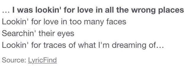 I quoted a line from an ole country song a couple of days ago that says, “I was looking for love in all the wrong places.” The extended quote from the song performed by Johnny Lee goes: