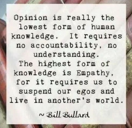 A Cherokee proverb says, “Before judging your neighbor one should first walk a mile in their moccasins.” The great problem with opinions, informed or not, religious, political, or sporting is that we have a tendency to grant too much preference to our own opinions thinking them somehow sacrosanct. They are not and we would do well to hold them lightly allowing them to change as new information presents itself.