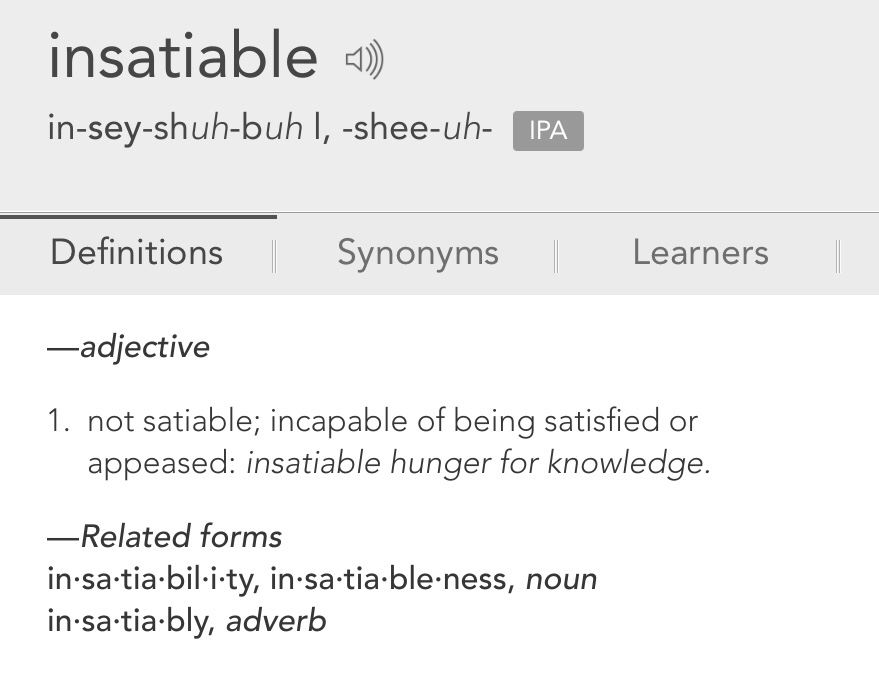Above is the dictionary definition of the word insatiable. Many of us sexual creatures may wish we had a partner that exhibited an insatiable desire for us, but those who have, I am told, find it a very demanding and unpleasant experience. We can only take their word for that, but we have all experienced how very difficult it is to try to please someone who is impossible to please.