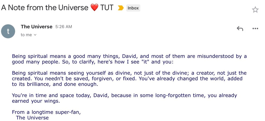 For some years now I have received Notes From The Universe and have found them to be both inspirational and encouraging. If you would like to receive them, I am sure my friend Mike Dooley would be happy to add you to his mailing list. Just Google, Notes From The Universe to subscribe.