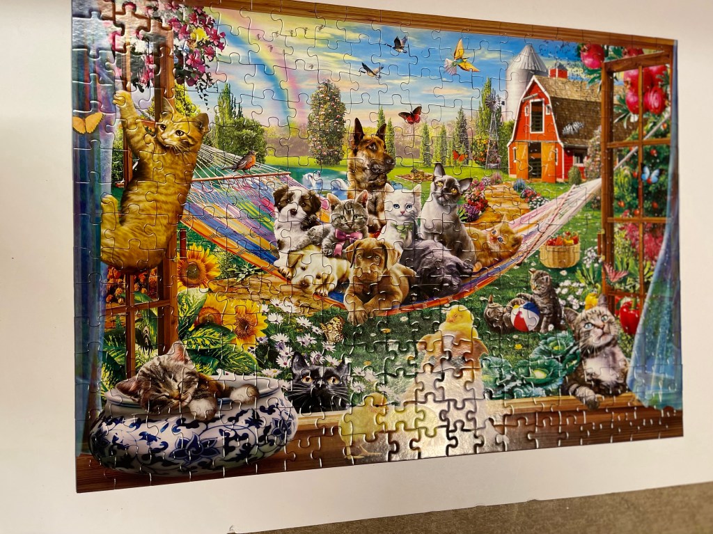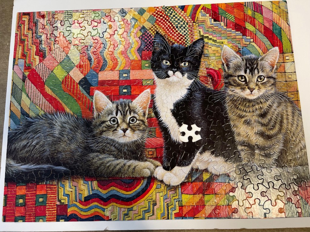 We looked hard for that missing piece because we hate to find them later after we have discarded the puzzle. It seems such a waste especially if it was a fun one like the three kitty one above or the last one we put together yesterday with several kitties and puppies playing together.