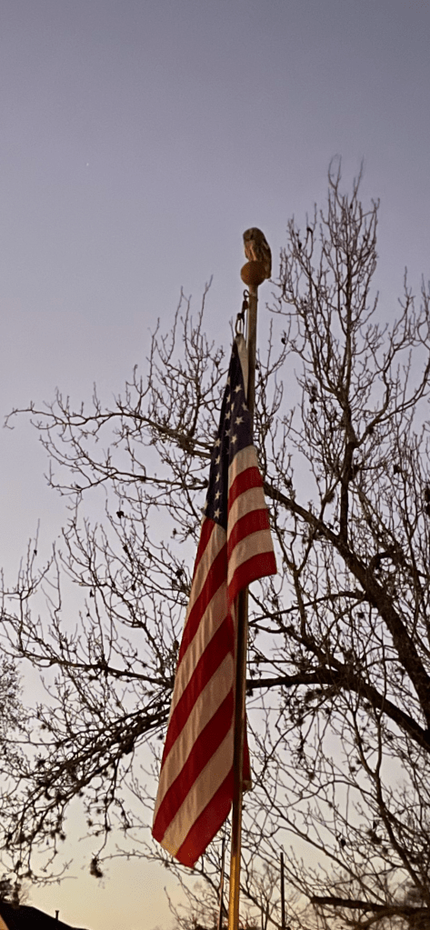 Last night just before dark our sister and mother were backing out of our driveway and as is our custom my wife and I were waving bye to them from the porch. I noticed a couple waking down the sidewalk in front of our house had stopped and were looking up. At first I thought they were looking up into the bare limbs of our apple tree but they were looking at the top of our flag poll. Then I distinctly heard them say, “Is that a baby owl? Take a picture.” I had my phone in my back pocket so I snapped a shot of our little visitor before he or she took flight.