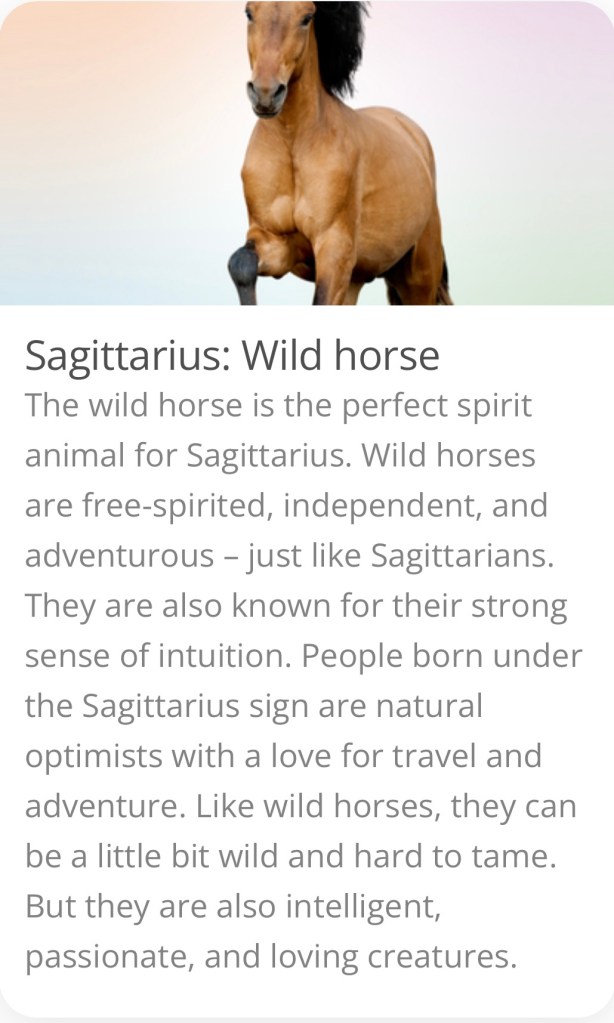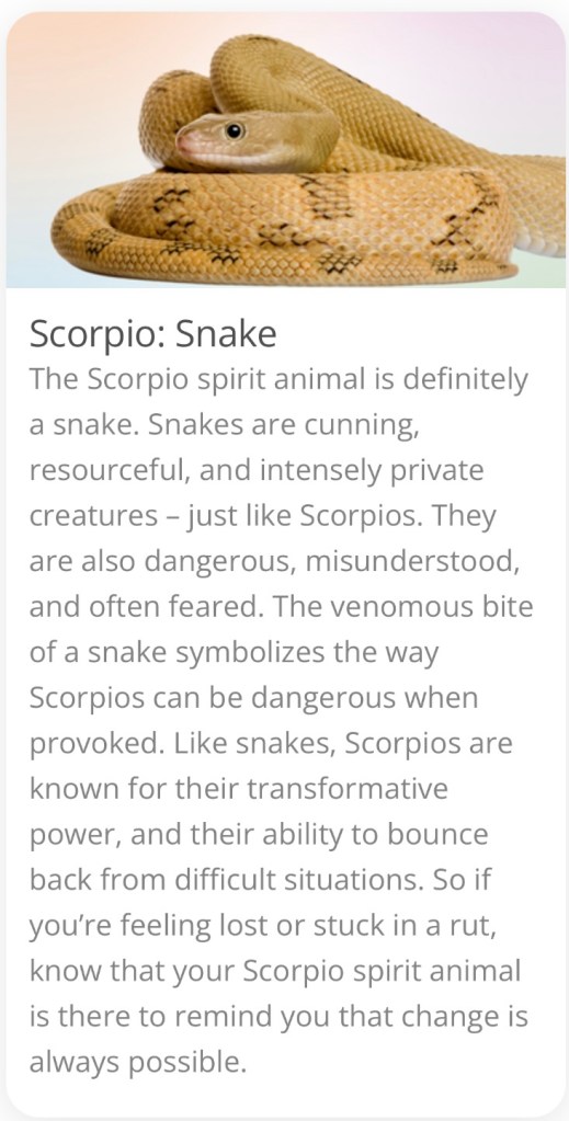 In doing a little online research regarding spirit animal guides I found an article regarding spirit animals replacing the zodiac signs. Since my birthday, November 22nd, falls on the last day of Scorpio on some charts and the first day of Sagittarius on others I attach the suggested spirit animal substitutions for both: