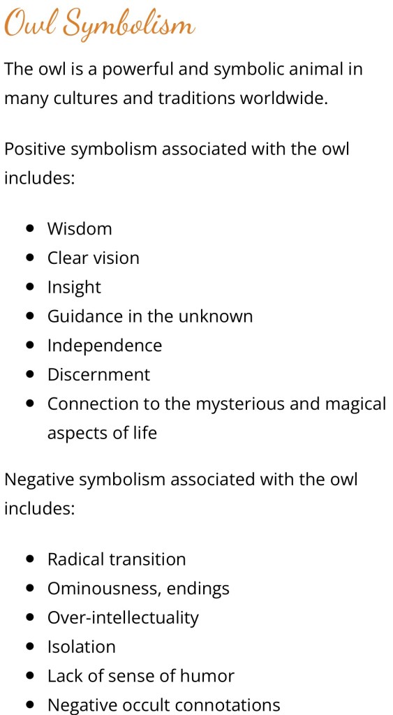 The two above cited visits from owls have me wondering if maybe the owl is my spirit animal guide. Owls like people have admirable traits and some to be wary of as well: