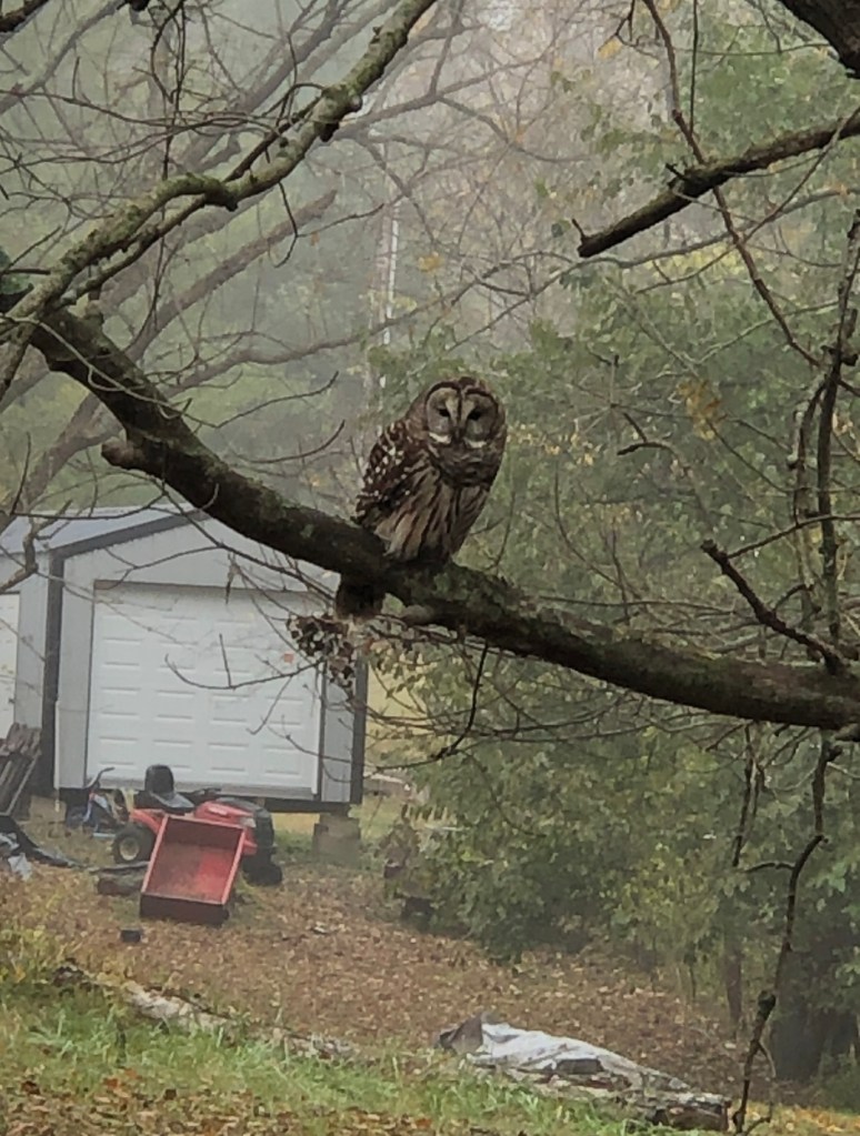 On my next to last work assignment a couple of years ago in Indiana, as the pipeline construction crew that I was following was beginning their last job before the winter layoffs we had a large owl visit us on the work site. With my handy IPhone I got this picture of our visitor.