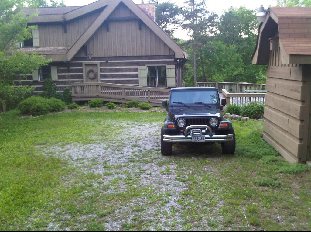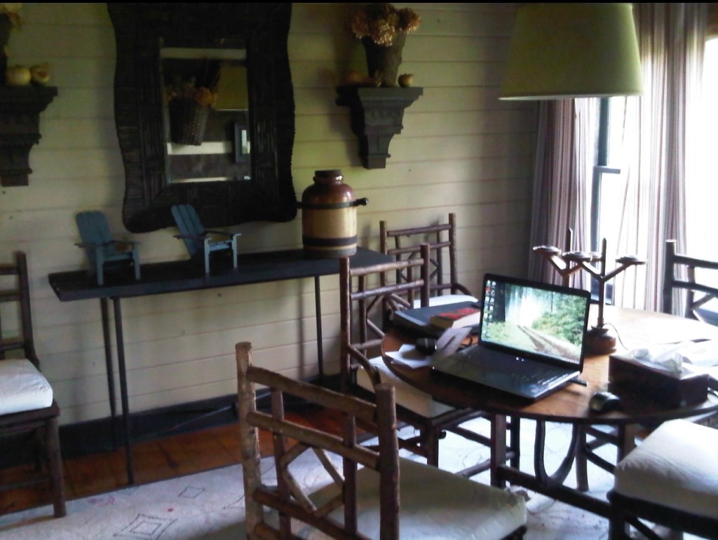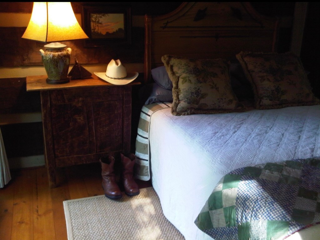I spent the night in my brother’s cabin on that brief detour on my way home. It was a lovely cabin, that reminded me more of a ski lodge or Swiss Chalet than a cabin. While I was there I took a few picture showing my Jeep, cowboy hat, boots, and laptop, to help me visualize myself living there as I sent a sincere request out to the Universe for a work assignment nearby.
