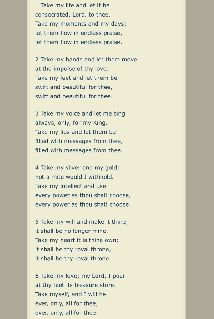 To be inspired is to be a clear channel, open and unobstructed. Pure imagination comes to us when we make all our faculties available to our higher power. One of the most moving Christian songs ever written is Take Me Life by Frances R Havergal in 1874.