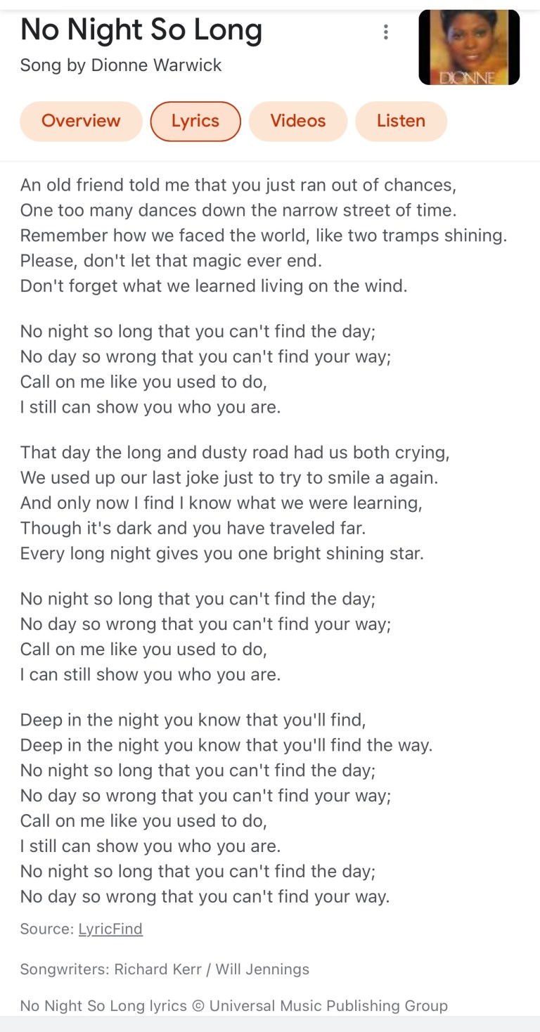I have long been a fan of Dionne Warwick and some years ago on one of her many albums I found one of her lesser known songs that I believe to be one of her best. Attached are the entire lyrics and my own karaoke version of the song and a children’s story reading that seemed to fit with the today’s theme.