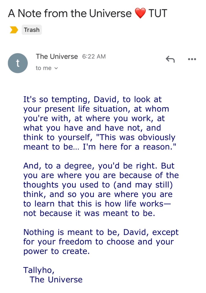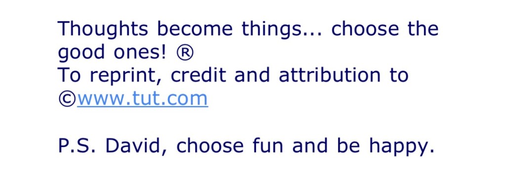 Today’s encouraging words Snaffle and Snuggle remind me of a phrase from the Terminator time traveling series of movies, “There is no fate but what we make.” We choose the thoughts that we dwell upon and that we verbalize and it is these that create our current reality. If we do not like what is going on in our life we have only to change our thinking and all the rest will follow. Instead of blaming our situation on fate we need to take responsibility for our thoughts. And as that ole Love Note Passer, Mike Dooley says – “Choose the good ones.”