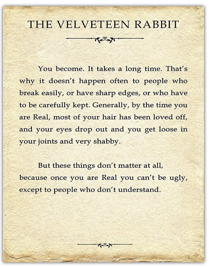 Today I read for you one of my favorite children’s books, The Velveteen Rabbit. Its lesson that love makes you real is a lesson I believe we all learn eventually. More than silver or gold or money untold love is the treasure we all want to hold.