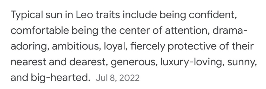Lions have a reputation of roaring and devouring, yet Leo’s are even more “fiercely protective of their nearest and dearest, generous, luxury-loving, sunny and big hearted.” Yes, that describes you to a tee, my friend. Let me hear that roar again.